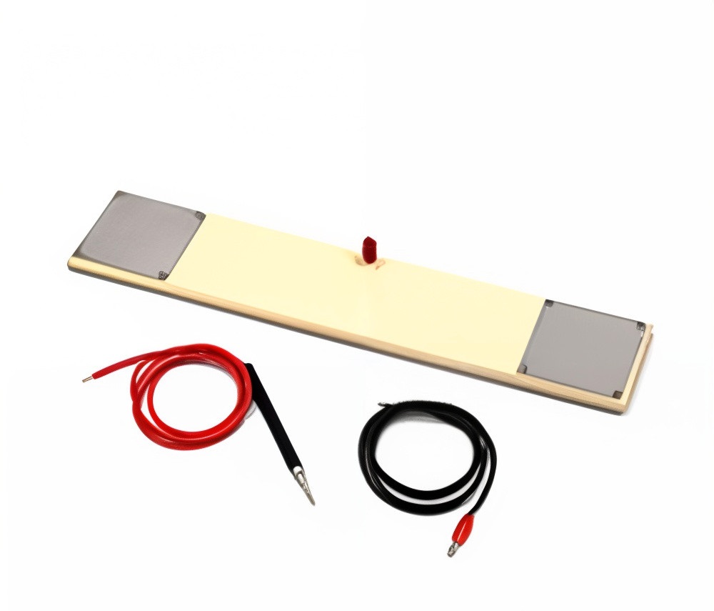 This apparatus helps evaluate an elementary psychomotor skill. While using a metal-tipped stylus, the subject’s task is to tap, as rapidly as possible, the two fixed 3.5-inch square plates at each end of an 18-inch board. A timer / counter, such as the Model 54060A Economy Clock/Counter, can be used for data collection.